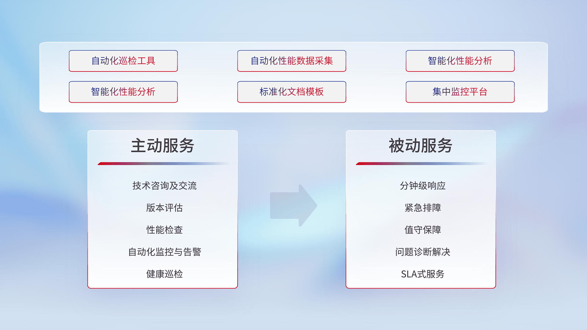智能化工具和标准化文档,,保障服务质量,,,,提供主动服务(包含技术咨询、、版本评估、、、、性能检查、、、自动化监控与告警、、、健康巡检)和被动服务包含(分钟级响应、、、、紧急排障、、、值守保障、、、问题诊断解决、、、、SLA服务)。。